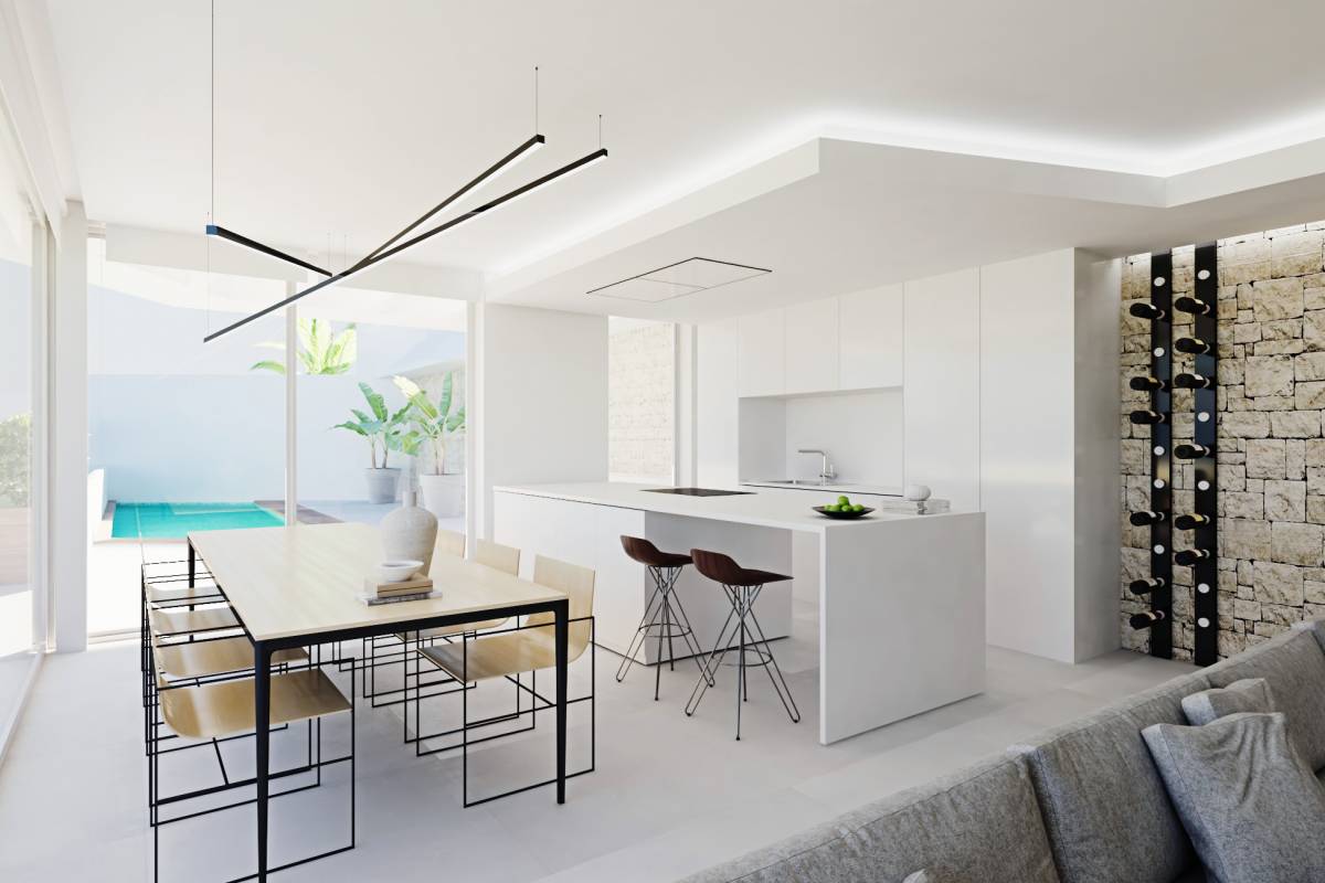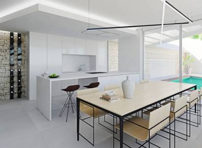 El interior de las propiedades en este residencial de Pueblo Mascarat está diseñado para ofrecer un espacio moderno y confortable. Con una distribución que incluye tres dormitorios y dos baños, cada propiedad está pensada para satisfacer las necesidades de las familias modernas. Los armarios empotrados proporcionan un amplio espacio de almacenamiento, mientras que el suelo de plataforma flotante añade un toque de elegancia y calidez a los espacios. La cocina está equipada con electrodomésticos de alta gama, facilitando las tareas diarias. El sistema de aire acondicionado y la calefacción por suelo radiante garantizan un ambiente agradable durante todo el año. La domótica integrada permite controlar diversos aspectos del hogar de manera sencilla y eficiente, mejorando la calidad de vida de sus residentes.