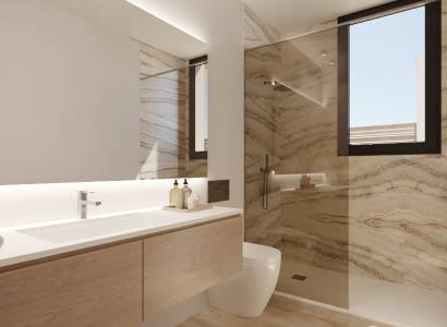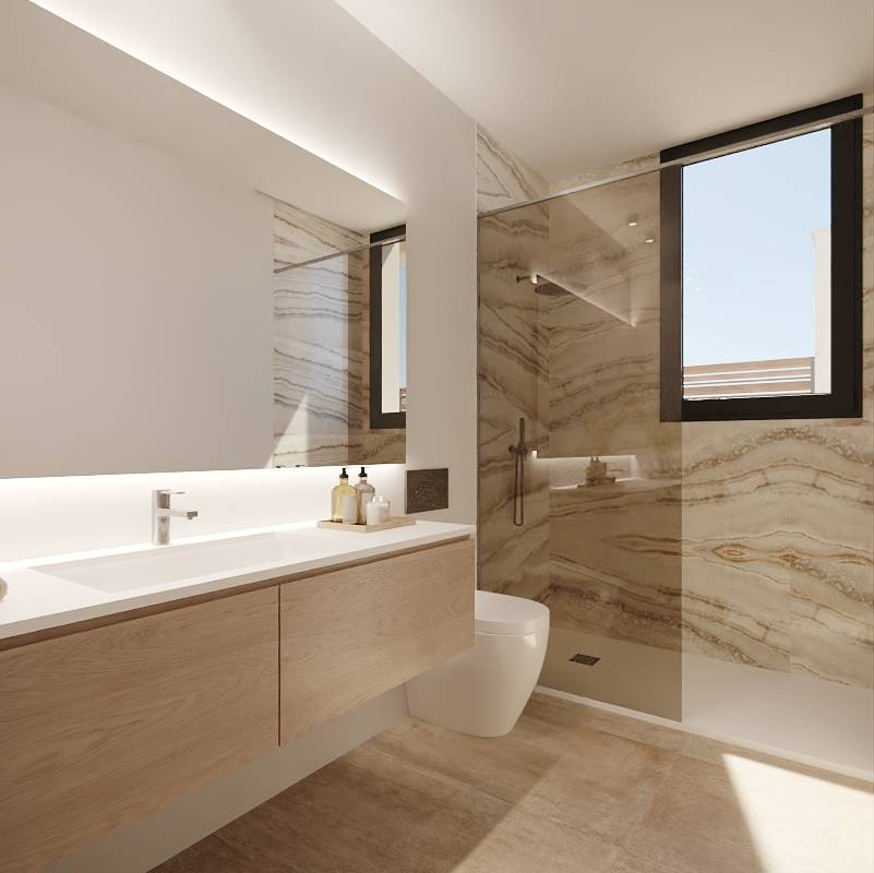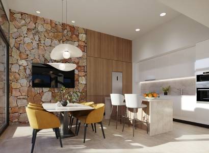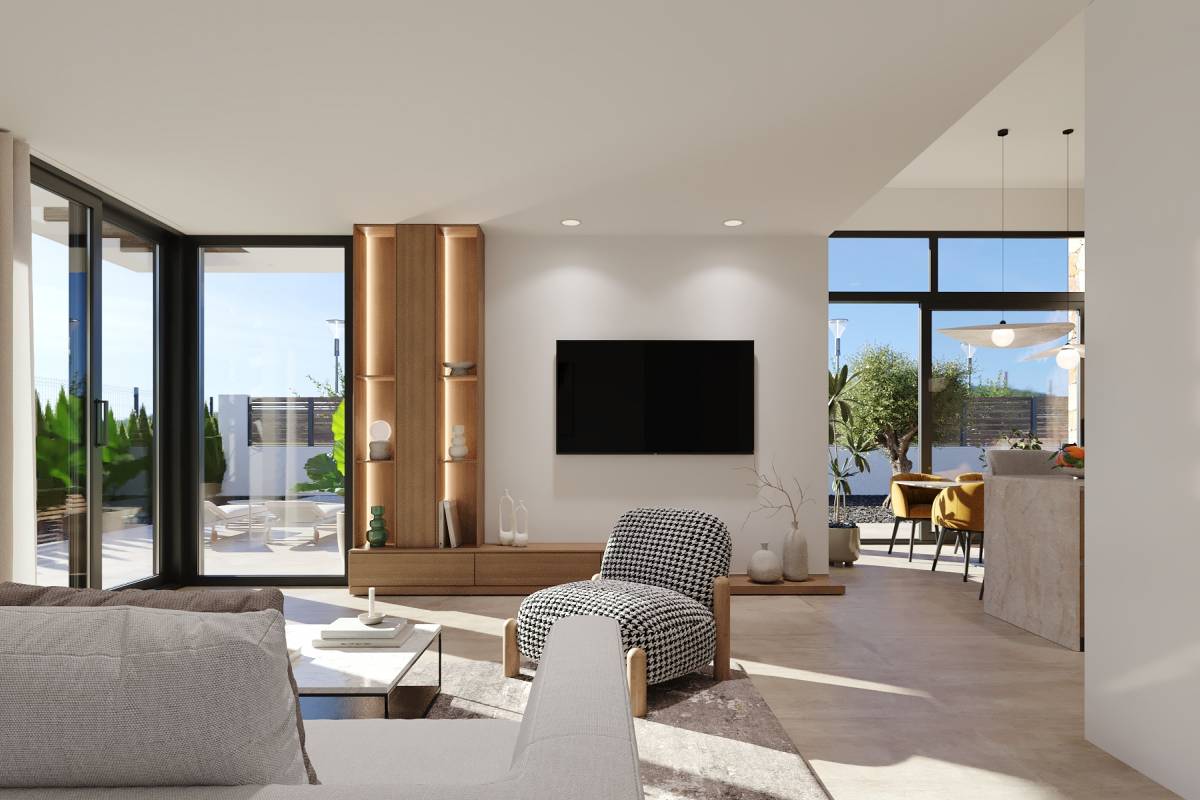 El interior de estas viviendas independientes en Fuente Álamo está diseñado para maximizar el confort y la funcionalidad. Con una distribución que incluye tres dormitorios y dos baños, cada vivienda está pensada para satisfacer las necesidades de familias modernas. Los armarios empotrados proporcionan un amplio espacio de almacenamiento, mientras que el sistema de aire acondicionado asegura un ambiente agradable durante todo el año. La inclusión de un video portero añade un nivel extra de seguridad y comodidad. Los suelos de gres porcelánico no solo son estéticamente atractivos, sino también duraderos y fáciles de mantener, contribuyendo a un ambiente interior elegante y práctico.