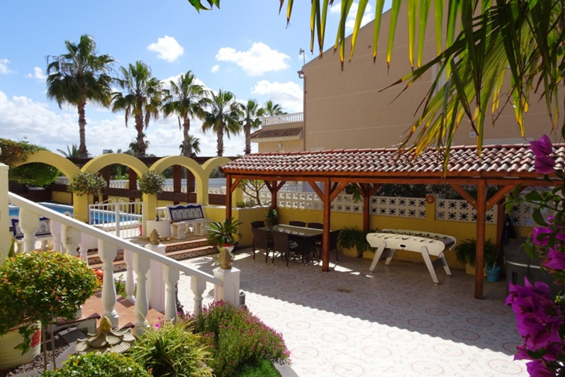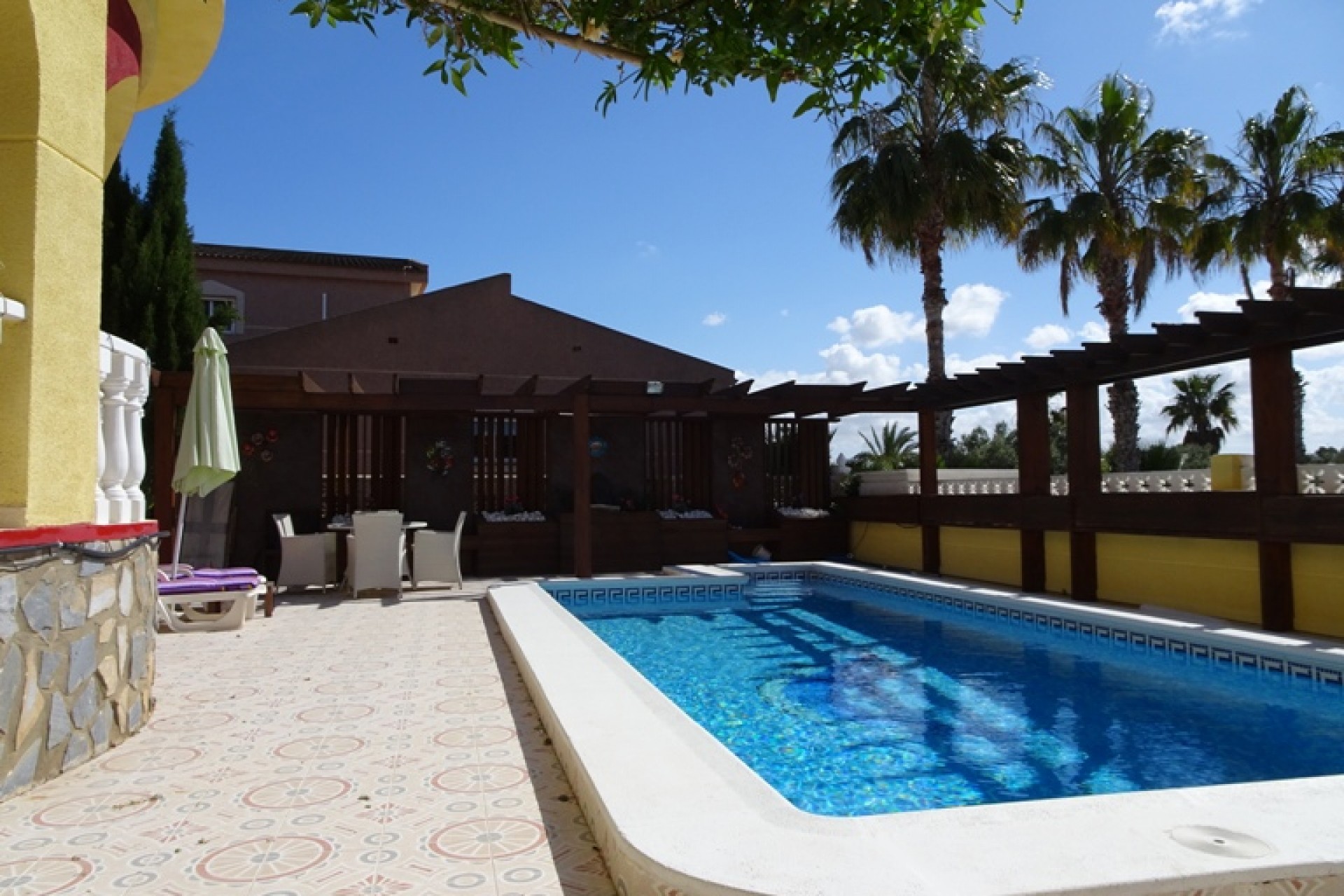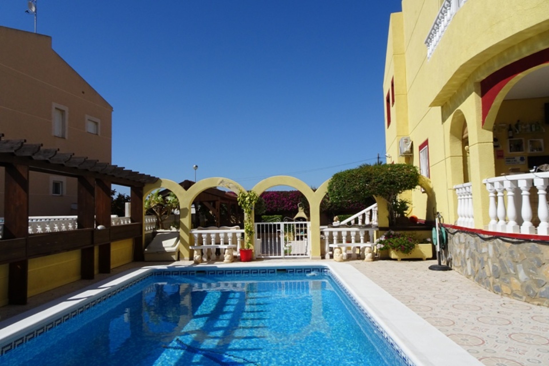 Ce coin, plein sud, Trois Chambres Villa individuelle à Monte Azul est situé sur un quartier calme et résidentiel, l'urbanisation très juste à l'extérieur des villes de Ciudad Quesada et Benijofar. Situé à quelques minutes en voiture ou 20 minutes à pied de la station de services tels que les bars, restaurants, boutiques, supermarchés et plus… Les plages les plus proches se trouvent également à moins de 15 minutes en voiture à Guardamar del Segura. Cette belle propriété se compose d'une cuisine équipée/salle à manger, qui a été modernisé à un niveau élevé, ce qui conduit à travers une double portes sur le jardin & barbecue, salon séparé avec accès par l'avant, terrasse couverte d'une grande taille, équipé d'un bar avec tabourets et aussi beaucoup d'espace pour manger dehors ; un deuxième salon, actuellement utilisé comme salle de télévision ; trois chambres doubles au premier étage, le maître avec salle de bains privative et d''une terrasse privée, avec une vue magnifique sur les environs au-delà de la campagne, une salle de bains familiale, une salle de douche et un vestiaire ! ! ! L'extérieur est un sol carrelé principalement, et couvertes de jardin d'environ 515m2, aménagé avec des plantes, arbres, arbustes, fleurs, d'une salle de 10 x 4 piscine, parking pour deux voitures, une caractéristique gazebo ombragé idéal pour manger en plein air, un espace barbecue et bien sûr beaucoup d'espace pour s'asseoir, se détendre, bronzer et profiter de la vie espagnole et le soleil ! ! ! Extras : placards, climatisation dans tout, le gaz naturel, des barbecues, grilles de porte fenêtre, un Jacuzzi et une salle de stockage dans le cadre de construire… Occasion ! ! !