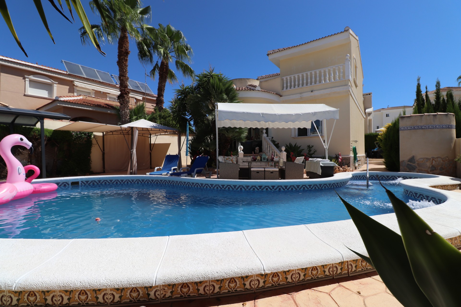 Deze prachtige vrijstaande villa met drie slaapkamers in La Fiesta ligt in het gebied Ciudad Quesada, dicht bij de golfbaan La Marquesa en Recorral. Gelegen op een paar minuten rijden van alle voorzieningen en faciliteiten die dit gebied te bieden heeft, met alles wat je nodig zou kunnen hebben. De prachtige stranden van Guardamar zijn ook slechts 8 minuten rijden. Deze woning bestaat uit een aparte volledig ingerichte keuken met aangrenzende meterkast en deur naar de tuin; ruime woon / eetkamer die uitkomt op de voorkant, overdekt terras, dat is gemaakt in een prachtige ontspanningsruimte, met uitzicht op de privétuinen en het zwembad; een tweepersoonsslaapkamer beneden; een garderobe beneden; nog twee tweepersoonsslaapkamers op de eerste verdieping, de master met toegang tot een eigen terras, met uitzicht op de open ruimte, de tuin en het zwembad; plus een grote familiebadkamer ... Buiten is een betegelde, gemakkelijk te onderhouden tuin met een paar planten, bomen en struiken, plus een tuinhuis aan de achterkant, off-road parking onder de carport, het privézwembad en natuurlijk voldoende ruimte om te dineren, zitten, relaxen, BBQ en genieten van de Spaanse levensstijl in de buitenlucht! Extra's zijn airconditioning, inbouwkasten, plafondventilatoren, verbeterde stopcontacten met USB, enz ... Geweldige prijs!