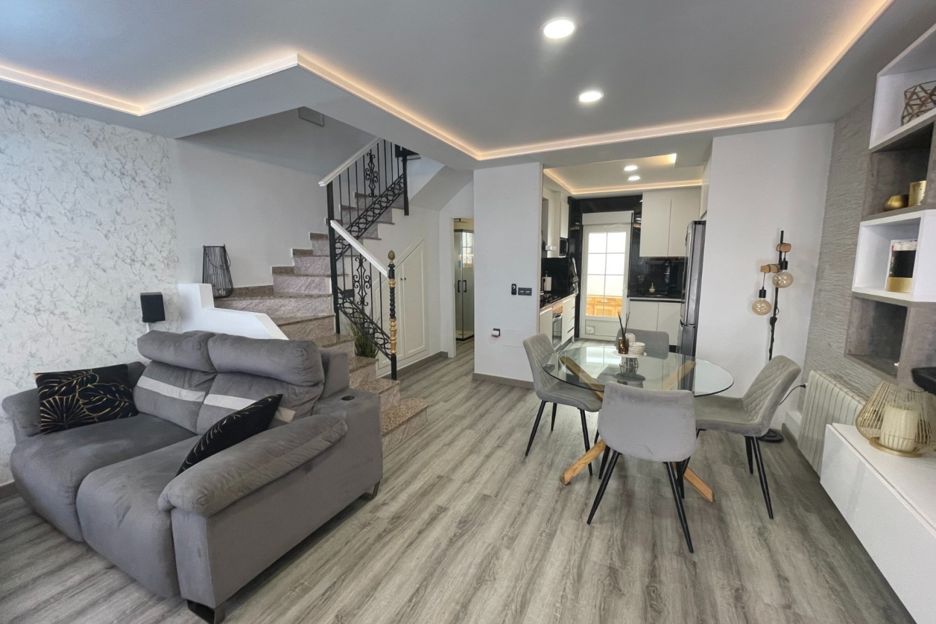 Deze op het zuidoosten gelegen halfvrijstaande villa met drie slaapkamers in Villamartin is gelegen in een populaire en gevestigde wijk van de Costa Blanca Zuid. Op slechts 10 minuten lopen vindt u een supermarkt, een café en de JYSK woonwinkel, en op nog eens 15 minuten lopen een winkelcentrum met diverse eetgelegenheden. De beroemde golfbaan van Villamartin ligt op slechts 5 minuten rijden, terwijl de prachtige stranden en het altijd populaire winkelcentrum La Zenia Boulevard binnen 10 minuten te bereiken zijn. Deze prachtig gemoderniseerde villa, gelegen op een gewild hoekperceel, beschikt over een stijlvol en licht interieur. Een glazen terras leidt naar de open woonkamer, met een trap naar de eerste verdieping direct naast de woonkamer. De prachtige ingerichte keuken is voorzien van moderne afwerkingen en biedt directe toegang tot een overdekt terras aan de achterzijde en een bijkeuken. Een strakke doucheruimte op de begane grond zorgt voor extra gemak. Boven vindt u drie tweepersoonsslaapkamers, waarvan twee met inbouwkasten. De hoofdslaapkamer is voorzien van een plafondventilator en de derde slaapkamer komt uit op een heerlijk privéterras. Een moderne doucheruimte bedient de bovenverdieping. De buitenkant biedt een onderhoudsarme, betegelde tuin met een strak, modern design, evenals parkeergelegenheid op eigen terrein. De woning beschikt tevens over airconditioning in de woonkamer en twee slaapkamers, toegang tot een gemeenschappelijk zwembad en een handige berging. Een privésolarium maakt deze fantastische woning compleet en biedt zonnige plekken om te ontspannen en te dineren. Dit is een fantastische kans om een stijlvol huis te bezitten in het hart van Villamartin - ideaal voor vakanties, verhuur of permanente bewoning aan de Costa Blanca Zuid.