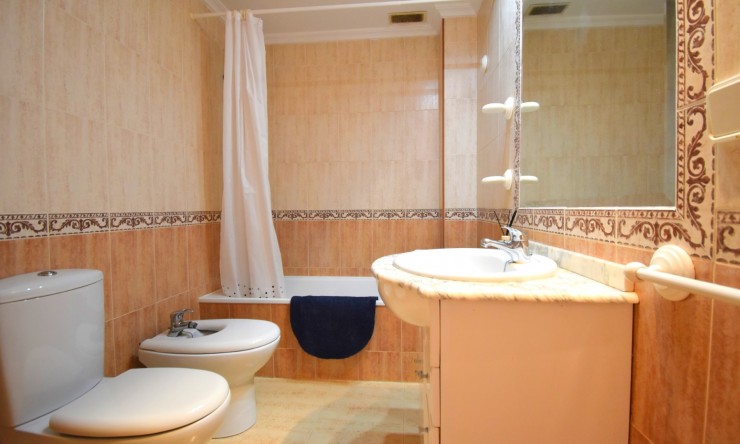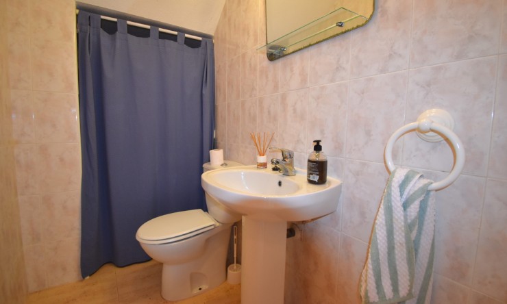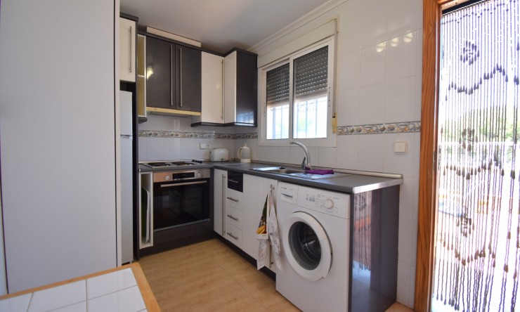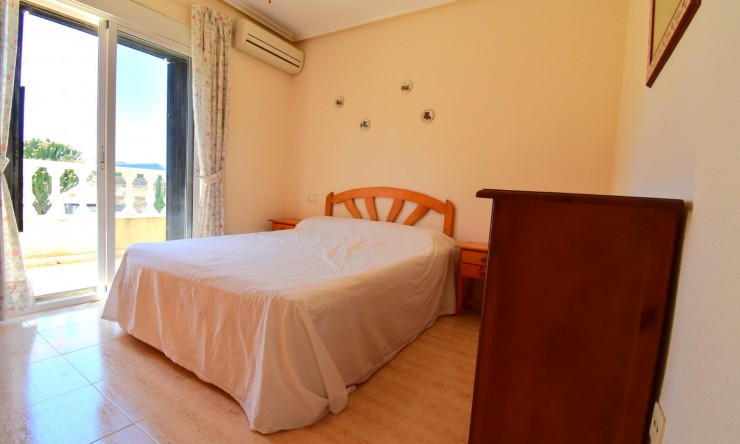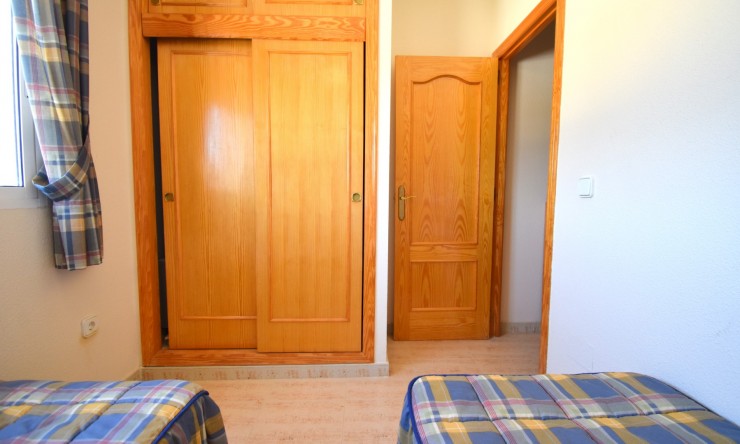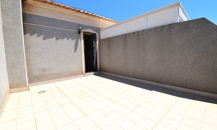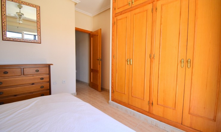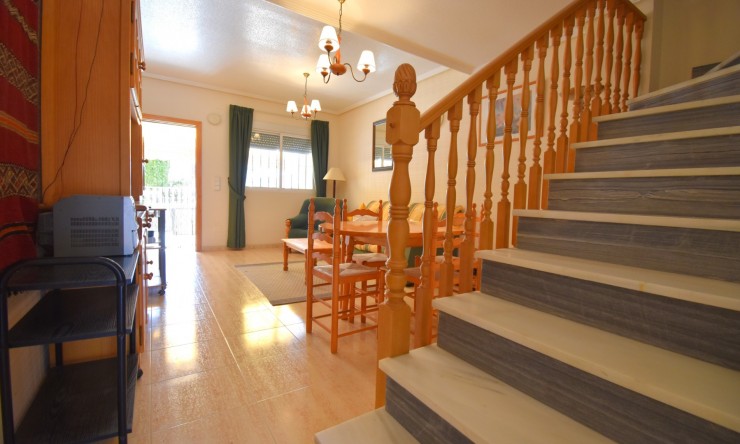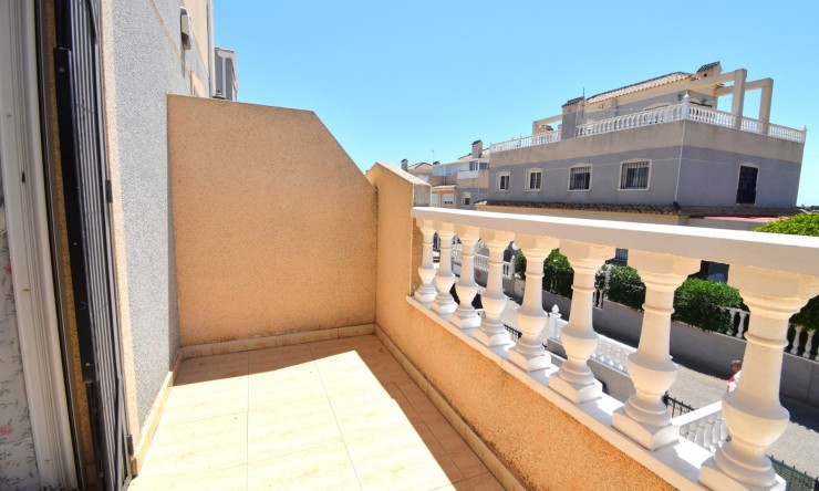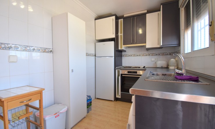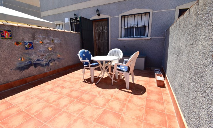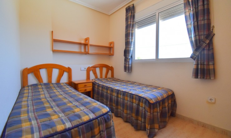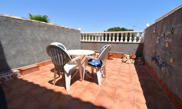 Deze op het westen gelegen woning met twee slaapkamers in Playa Flamenca is gelegen in een populaire en gevestigde wijk aan de Costa Blanca Zuid, op slechts een paar minuten lopen van diverse cafés en restaurants. Op 20 minuten lopen vindt u een supermarkt en winkelcentrum La Zenia Boulevard, terwijl de prachtige stranden en diverse gerenommeerde golfbanen binnen 5 minuten rijden te bereiken zijn. Dit maakt dit een ideale woning voor vakanties, verhuur of permanente bewoning. De woning is toegankelijk via een betegelde voortuin met parkeergelegenheid en een overdekt terras, perfect om te genieten van de middag- en avondzon. Binnen vindt u de woonkamer, een trap naar de eerste verdieping, een aparte, volledig ingerichte keuken met een deur naar een onderhoudsarme betegelde tuin aan de achterzijde en een handige toiletruimte op de begane grond. Boven zijn er twee tweepersoonsslaapkamers met inbouwkasten. De hoofdslaapkamer beschikt over een eigen terras en airconditioning, en beide slaapkamers hebben een eigen badkamer. Een interne trap leidt naar het privé dakterras, ideaal om te zonnen of in alle privacy te ontspannen. De woning maakt deel uit van een complex met afgesloten parkeergelegenheid en toegang tot een prachtig gemeenschappelijk zwembad. Gelegen in het hart van Playa Flamenca, biedt deze woning een fantastische kans om te genieten van het leven aan de Costa Blanca Zuid, met alle voorzieningen dichtbij en de mediterrane levensstijl voor de deur.