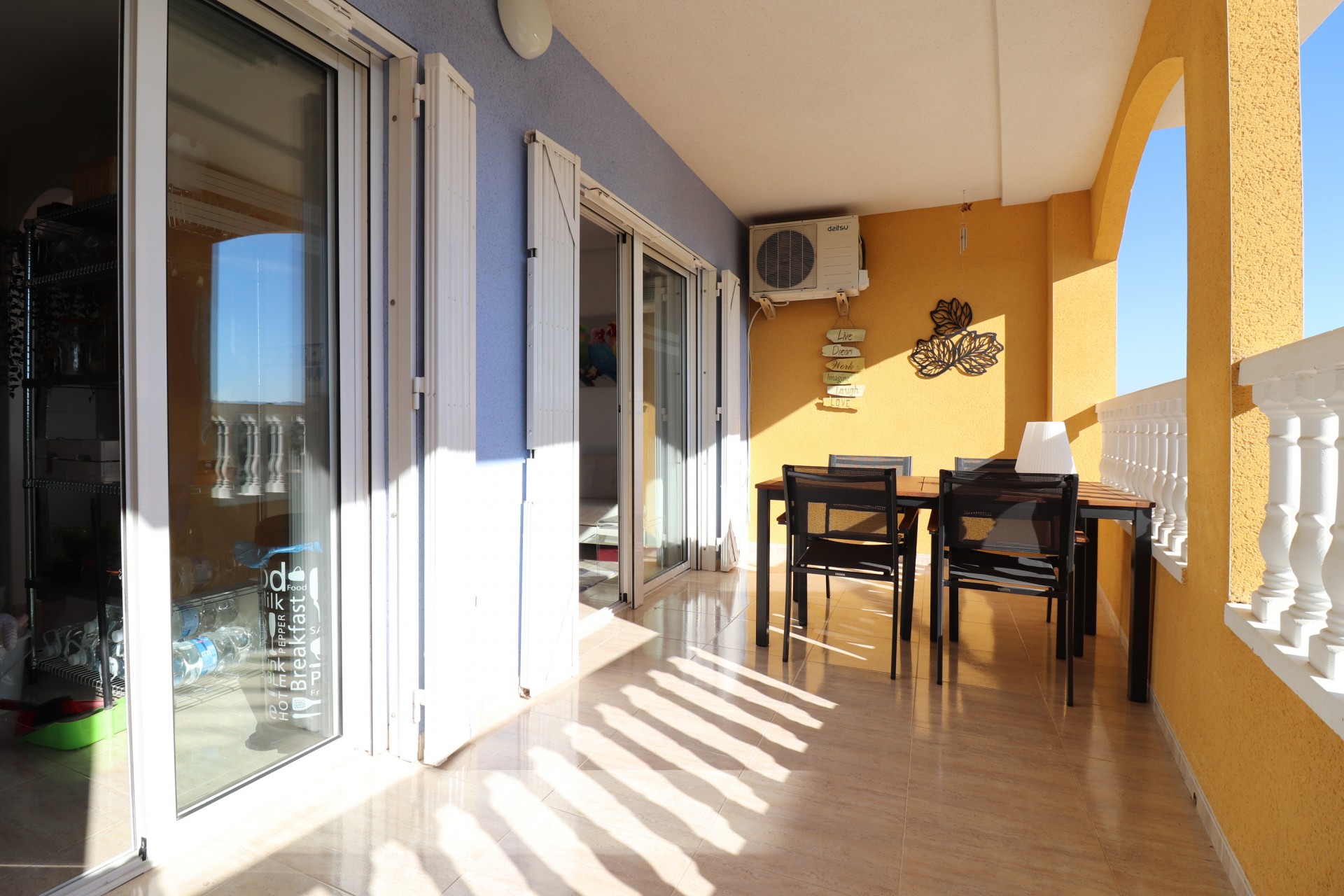 SOLGT SOM SETT - Denne sørvendte duplexleiligheten med tre soverom i Jacarilla ligger i utkanten av denne populære og tradisjonelle spanske byen, med utsikt over det store landskapet, men likevel innen 5 minutters gange fra alle dens fasiliteter og fasiliteter. Butikker og supermarkeder er også i nærheten, med strendene kun en 20-minutters kjøretur unna! Denne fabelaktige eiendommen består i hovedetasjen (1. etasje fra veinivå) av et separat fullt utstyrt kjøkken, med utgang til den solrike terrassen foran; stue/spisestue med skyvedører ut til den samme overbygde terrassen, av stor størrelse, ideell for å spise utendørs; og et modernisert dusjrom. På nivået oppe er det tre doble soverom, som alle har utgang til terrassen, med fantastisk utsikt over landet; og en andre modernisert walk-in dusjrom, ferdig til en meget høy standard. Innvendige trapper fører også til det enorme private solariet på taket, med stor, montert, uttrekkbar pergola, ideell for underholdning, grilling og mer, mens du nyter den herlige utsikten rundt området! Ekstrautstyret som følger med denne 120m2 eiendommen er som følger: klimaanlegg overalt, en parkeringsplass under bakken og selvfølgelig bruken av et felles svømmebasseng! En mulighet for en unik eiendom!