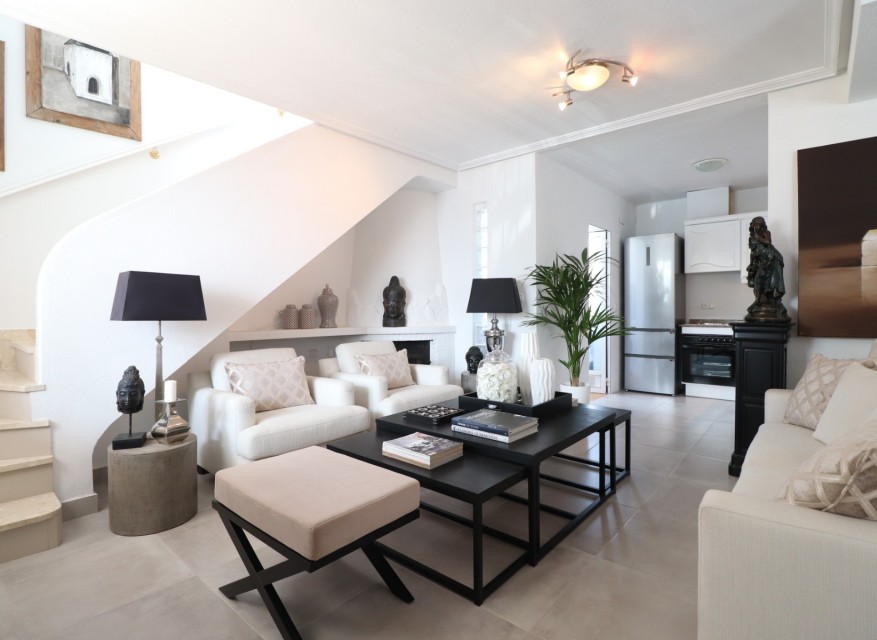 Denne østvendte, frittliggende villaen med to soverom i Los Balcones ligger i et svært ettertraktet boligområde på Costa Blanca Sør, bare en kort spasertur fra lokale fasiliteter. Filton kjøpesenter ligger bare en 10-minutters spasertur unna, mens en hovedkjede-supermarked kan nås på omtrent 15 minutter. Torrevieja sykehus ligger bare et par minutters kjøretur unna, med den pulserende byen Torrevieja, dens internasjonale marina og fantastiske strender, alt innen en praktisk 5-minutters kjøretur. Golfentusiaster vil også sette pris på at det bare er 15 minutter fra flere populære golfbaner. Denne villaen har blitt elegant modernisert til høyeste standard og har blitt upåklagelig vedlikeholdt, og tilbyr stilig, åpen planløsning. Den lyse og luftige stuen har trapp til første etasje og to sjarmerende peiser, noe som skaper en varm og innbydende atmosfære. Spisestuen – tidligere et dobbelt soverom – har beholdt en innebygd garderobe og kan enkelt omkonfigureres om ønskelig. En innglasset inngangsterrasse, perfekt for avslapning året rundt. Det elegante, moderne kjøkkenet har et separat vaskerom, og første etasje inneholder også et romslig dobbelt soverom og et familiebad. Ovenpå finner du et andre dobbelt soverom og et ekstra dusjrom, samt en nydelig stue som åpner ut mot den private takterrassen, hvor du kan nyte utsikten over de nærliggende saltsjøene. Villaen ligger på en tomt på 204 m² og kan skilte med en lettstelt, flislagt forhage med parkering utenfor veien, pluss en asfaltert bakhage. Det er innebygde garderober på soverommene og det er klimaanlegg i alle rom. Beboerne har også tilgang til et velholdt felles svømmebasseng, noe som gjør denne eiendommen til et ideelt heltidsbolig, feriested eller utleieinvestering.