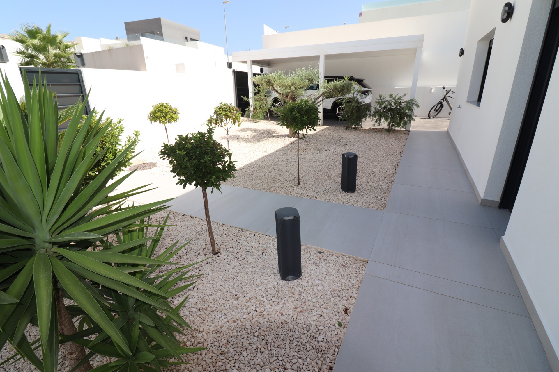 This, Stunning, Spectacular, Luxury, Modern, Corner Three Bedroom Detached Villa in Benimar III is located towards the top of this popular residential urb, between Benijofar and Ciudad Quesada. Situated within a 10-15 minutes walk Benijofar & Benimar amenities + facilities, whilst the beaches of Guardamar del Segura are only a 12 minute drive away! This As New As Opportunity was finished in 2021, comprising of a stylish, high quality, open plan fully fitted kitchen, with feature breakfast bar; living room with feature high ceiling and double large sliding doors out to the covered terrace, private swimming pool and gardens; three double bedrooms, all of a good size, however the master of a great size, with en suite shower room; a family shower room; and a separate utility room with side door to the garden. Outside is a desirably landscaped garden, mainly tiled and graveled for low maintenance, several plants and trees, private swimming pool, imprinted concrete driveway under the permanent car port for off road parking and of course plenty of room to dine, relax and enjoy the mountain range view. External stairs from the back of the property lead to the enormous solarium, with fitted bar, where you can really enjoy the panoramic mountain range and sunset views on offer, a perfect place for BBQ’s and entertaining! Extras with this property are to include electric driveway gate, upgraded large tiled throughout inside and outside, upgraded switches + USB port plugs, air conditioning, fitted and lined wardrobes in each bedroom, storeroom, pool house and much more... This one is not to be missed, ready to live in now!