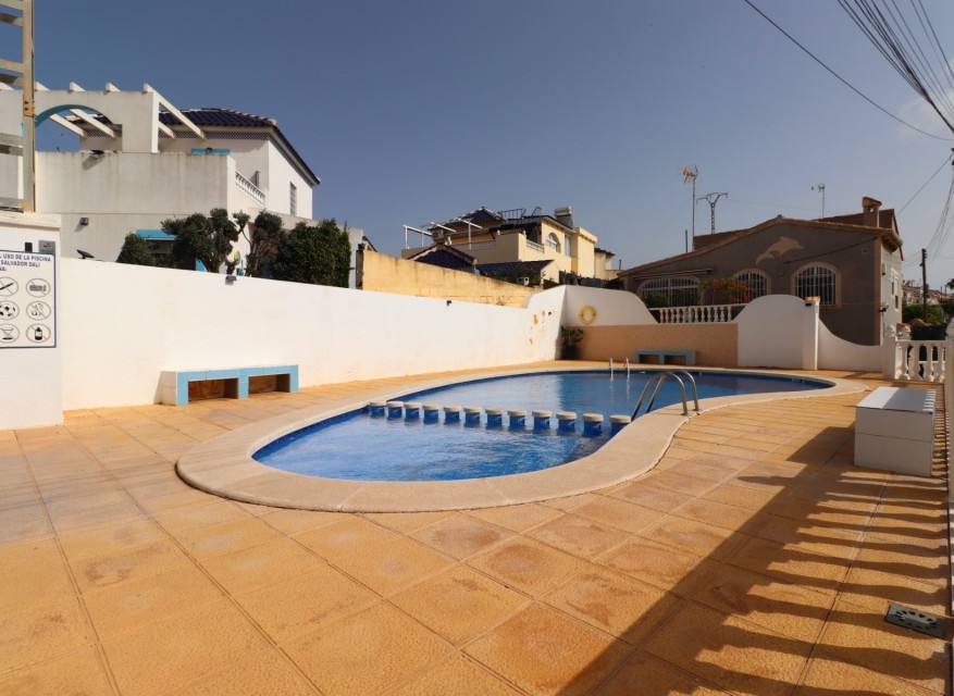 This East Facing, Two Bedroom, Townhouse in Los Balcones, is located on the borders of Orihuela Costa, ideally positioned just a 5 minute drive to the beaches of Torrevieja and close to the Torrevieja Hospital. The Filton commercial centre is just a 5 minute walk away, and a variety of golf courses accessible within a 15 minute drive radius.The property comprises a covered porch area leading into a bright living room with a corner fireplace featuring an electric insert, an American-style fitted kitchen, and a lobby area with access to the first floor. There is also a ground floor shower room and access out to the rear garden, which is both tiled and gravelled for low maintenance. On the first floor are two double bedrooms, each with wall heaters and fitted wardrobes, one of which benefits from a private terrace. A family shower room completes this level. External stairs lead up to the private solarium with a view overlooking the communal pool. With a tiled front garden, electric blinds on windows and situated in a sought-after part of the Costa Blanca South, this townhouse offers convenience, comfort, and an ideal location