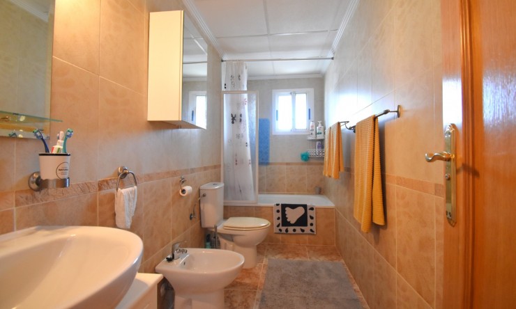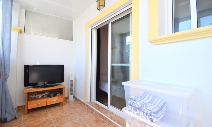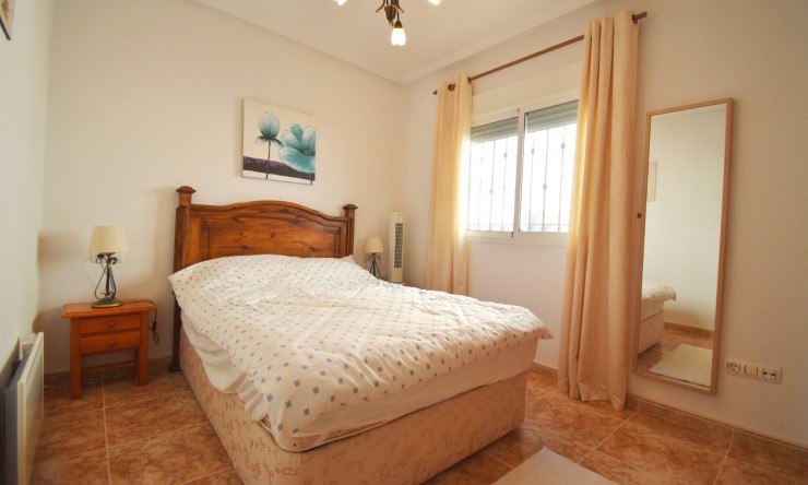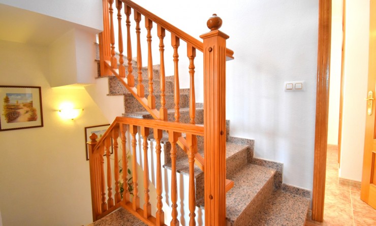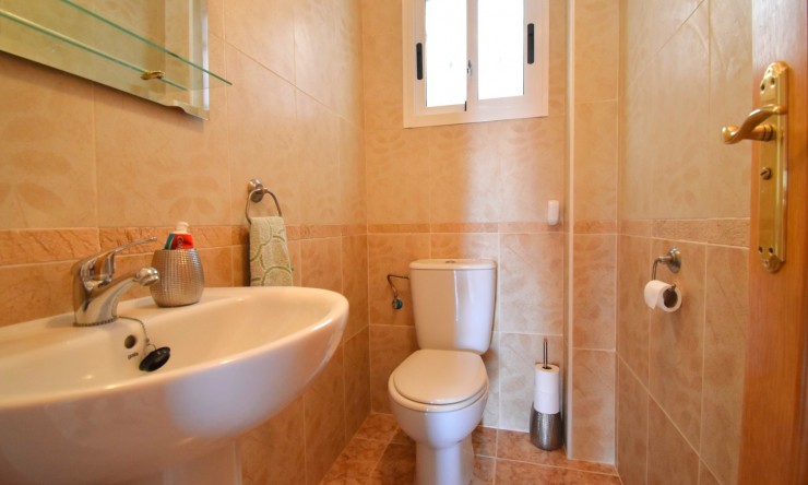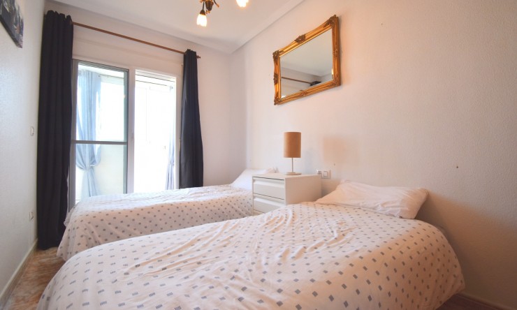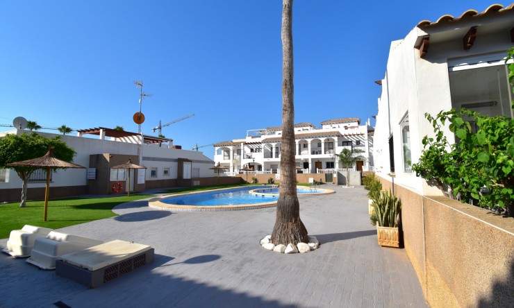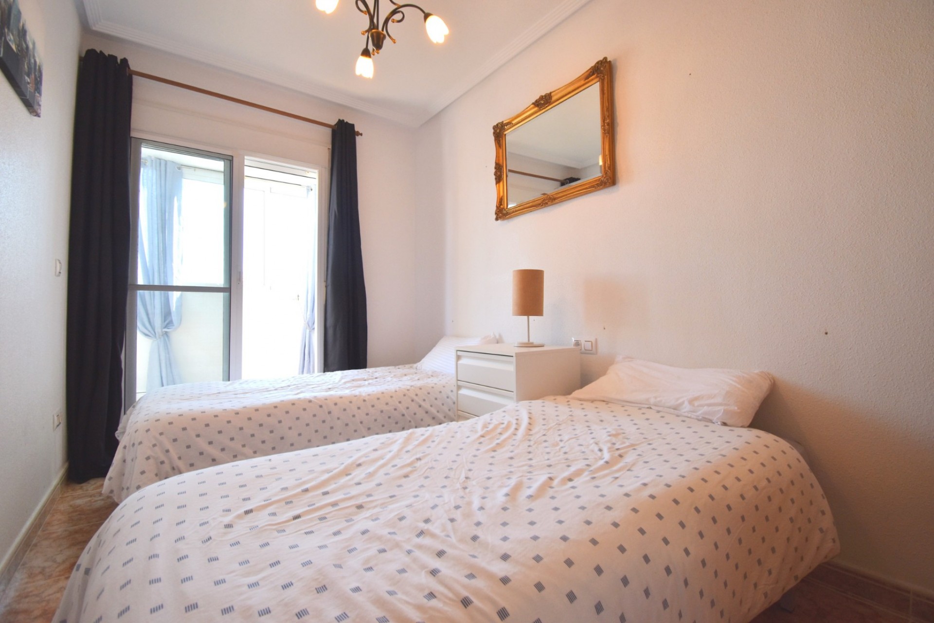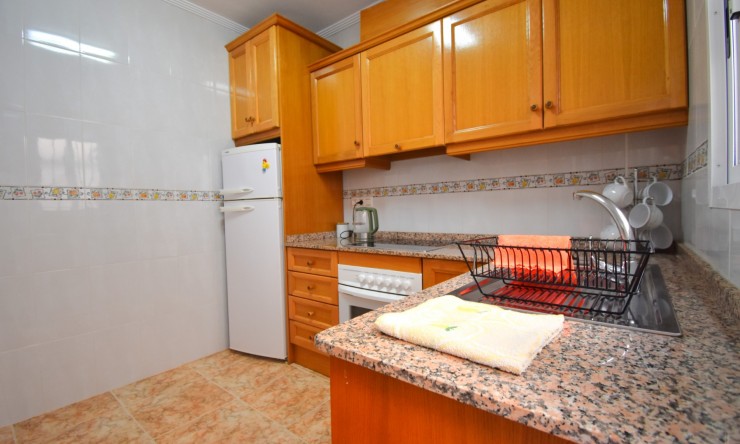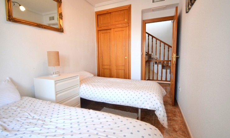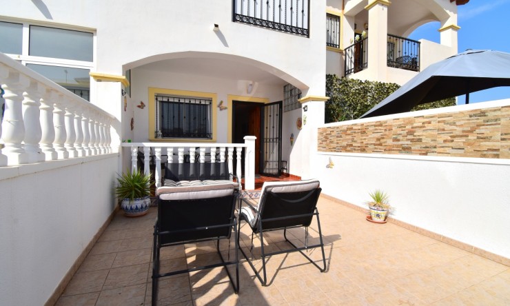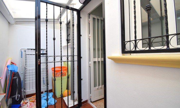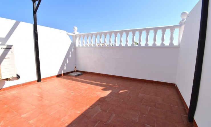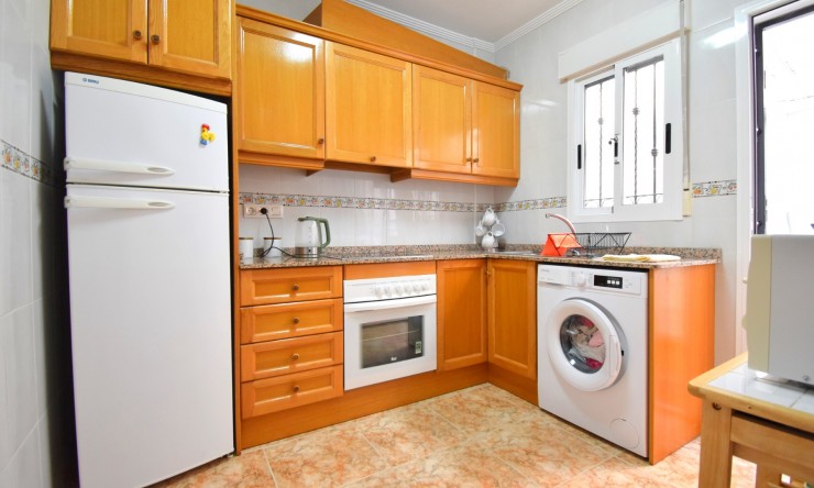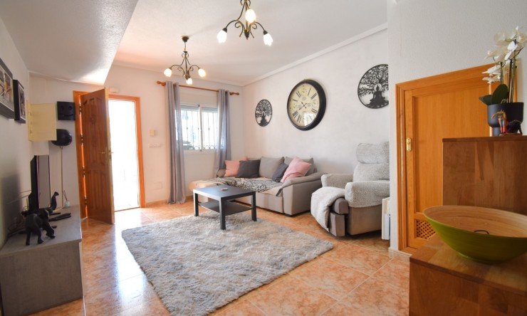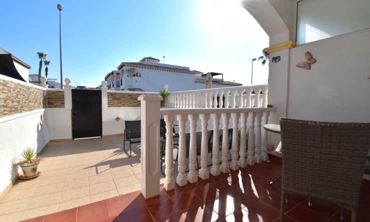 This Spacious, Two Bedroom, Townhouse in Punta Prima is located in a highly sought-after area, just a 15 minute walk to the Punta Marina shopping centre, which includes a main chain supermarket, cafés, and restaurants. The stunning beaches of Punta Prima and the La Zenia Boulevard shopping centre are only a 5 minute drive away, with a variety of top golf courses reachable within 10 minutes. Nicely presented throughout, the property features a generous lounge/dining room and a separate fitted kitchen with a door leading out to a covered patio and utility area. A convenient cloakroom completes the ground floor. Upstairs offers two double bedrooms with built-in wardrobes, a family bathroom, and a glazed-in terrace off the master bedroom, ideal as a relaxing additional space. External highlights include a front tiled garden with a covered terrace, perfect for outdoor seating. Internal stairs provide access to a private solarium, offering space for sunbathing and enjoying the Mediterranean climate. The home also benefits from ducted air conditioning, a lovely communal pool, and an underground parking space. Situated in Costa Blanca South, this property is ideal for holidays, investment, or full-time living.