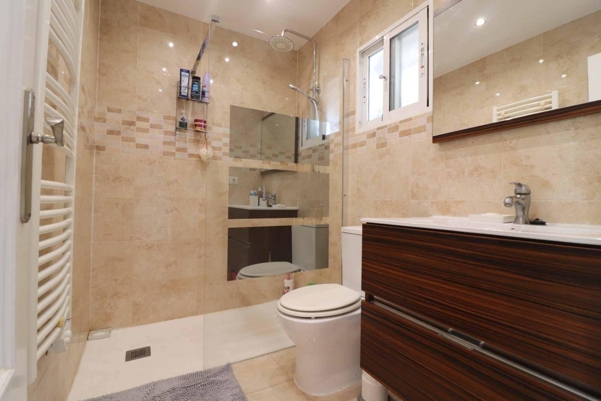 This West Facing, Three Bedroom, Townhouse in Montemar is located just a couple of minutes' drive from the charming Spanish village of Algorfa, and a 4-minute walk to bars, restaurants, and shops of the prestigious 5* La Finca Golf Hotel and Spa Resort. The beautiful beaches of the Costa Blanca South are around 20 minutes away, with major amenities in Almoradí just a 5-minute drive, and the popular towns of Quesada and Benijófar reachable in under 10 minutes. This lovely presented and well-maintained property boasts an 82m² build and is laid out across two levels. The ground floor comprises a bright lounge/dining room with a cosy pellet burner and stairs leading to the first floor, a separate modern and well-fitted kitchen with direct access to the rear tiled patio, and a ground floor double bedroom with en-suite shower room. Upstairs, you’ll find two further double bedrooms, including the master with built-in wardrobes plus access to a lovely sized terrace with a sun blind. There is also a family shower room on this level. From the terrace, stairs lead up to a private solarium, complete with BBQ area and enjoying a view across to the mountains – perfect for soaking in the sunsets. Outside, the front of the property features a tiled garden with an irrigation system and a lovely terrace area. There is also off-road parking within the community and access to a great communal pool. Additional features include updated flooring throughout, fly nets, and plenty of outdoor space to enjoy the Mediterranean lifestyle. This is a fantastic opportunity for either permanent living or a holiday home in a peaceful yet well-connected area of the Costa Blanca South.