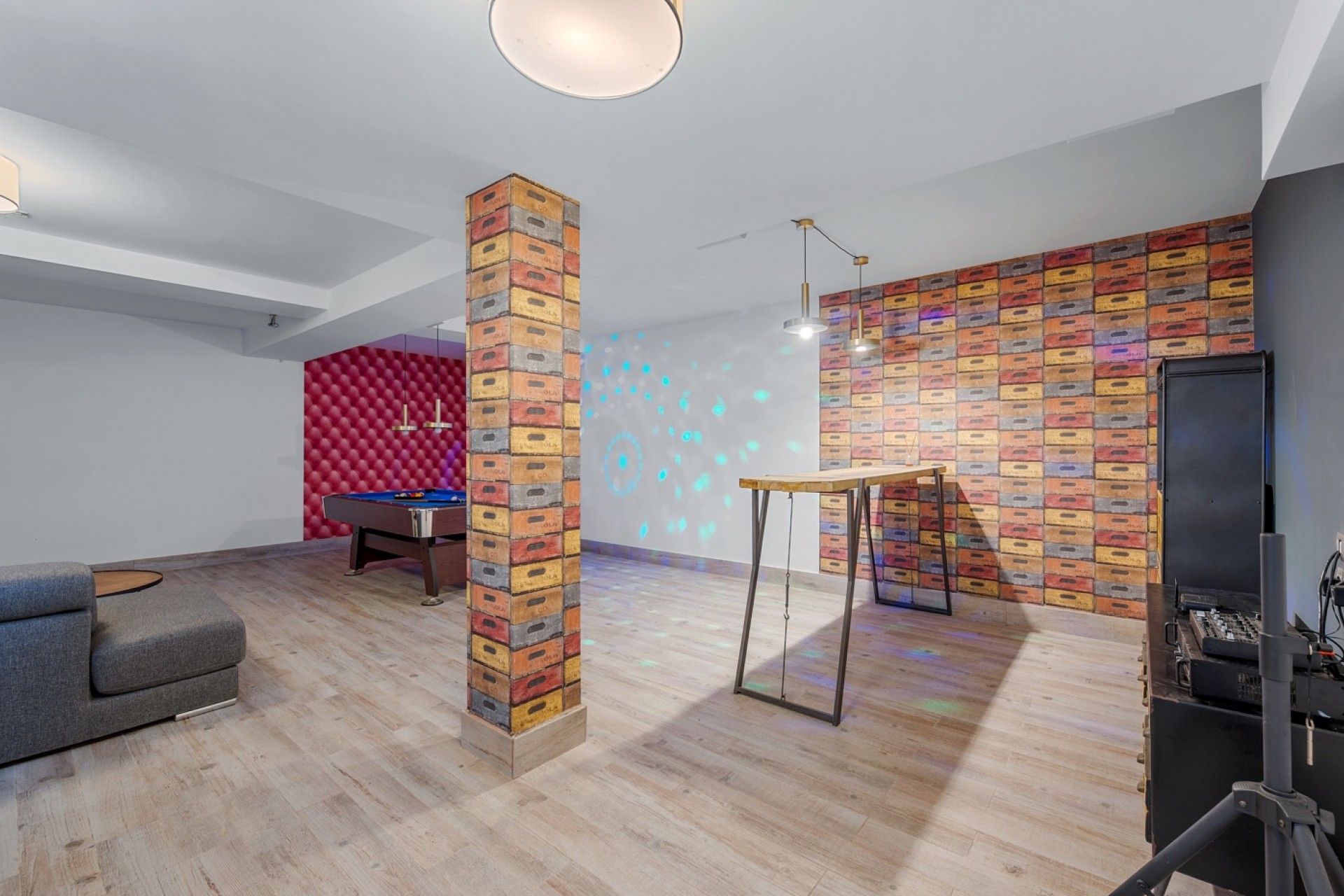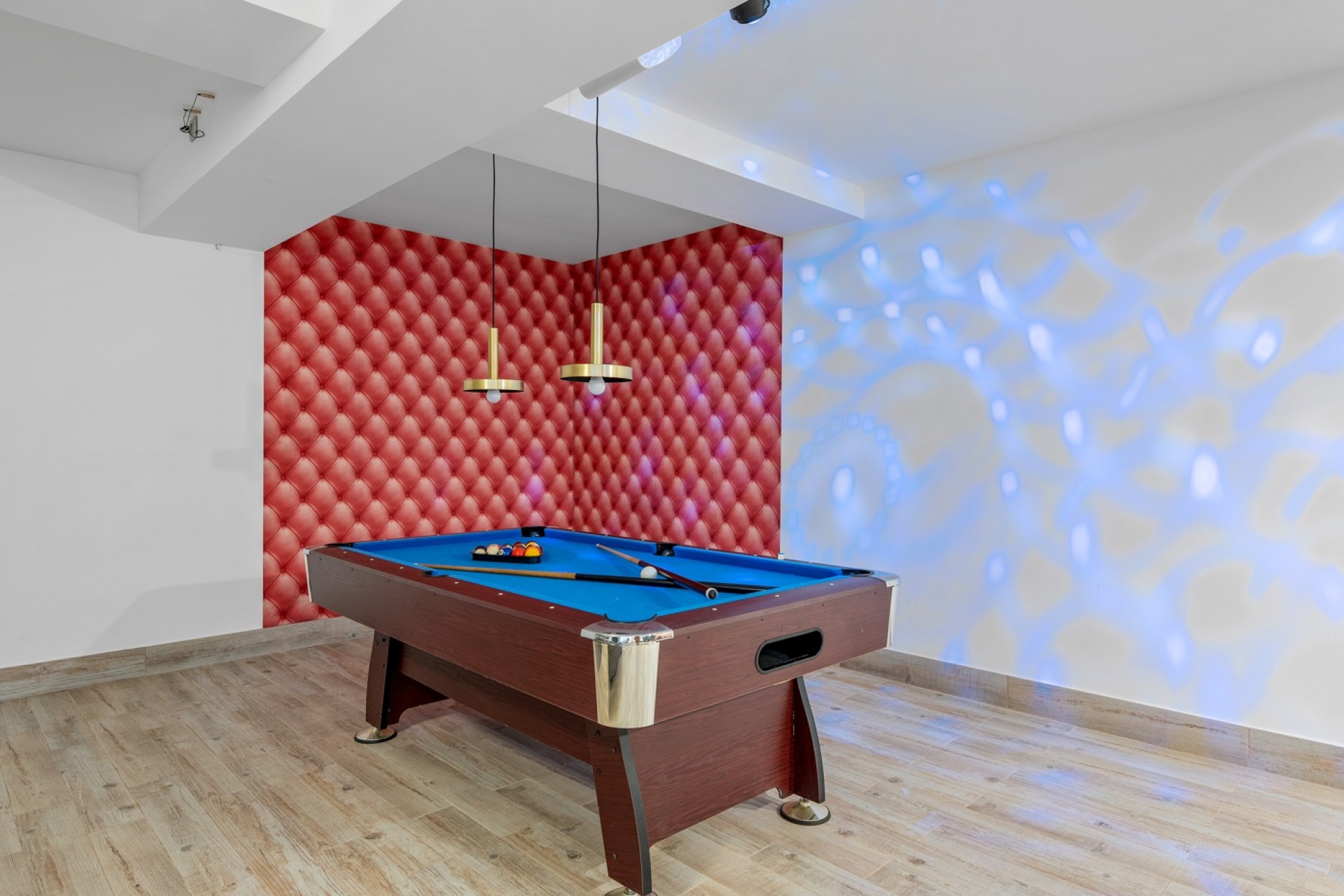 The basement is currently used as a recreational space with a billiard area and provides additional room for various uses.