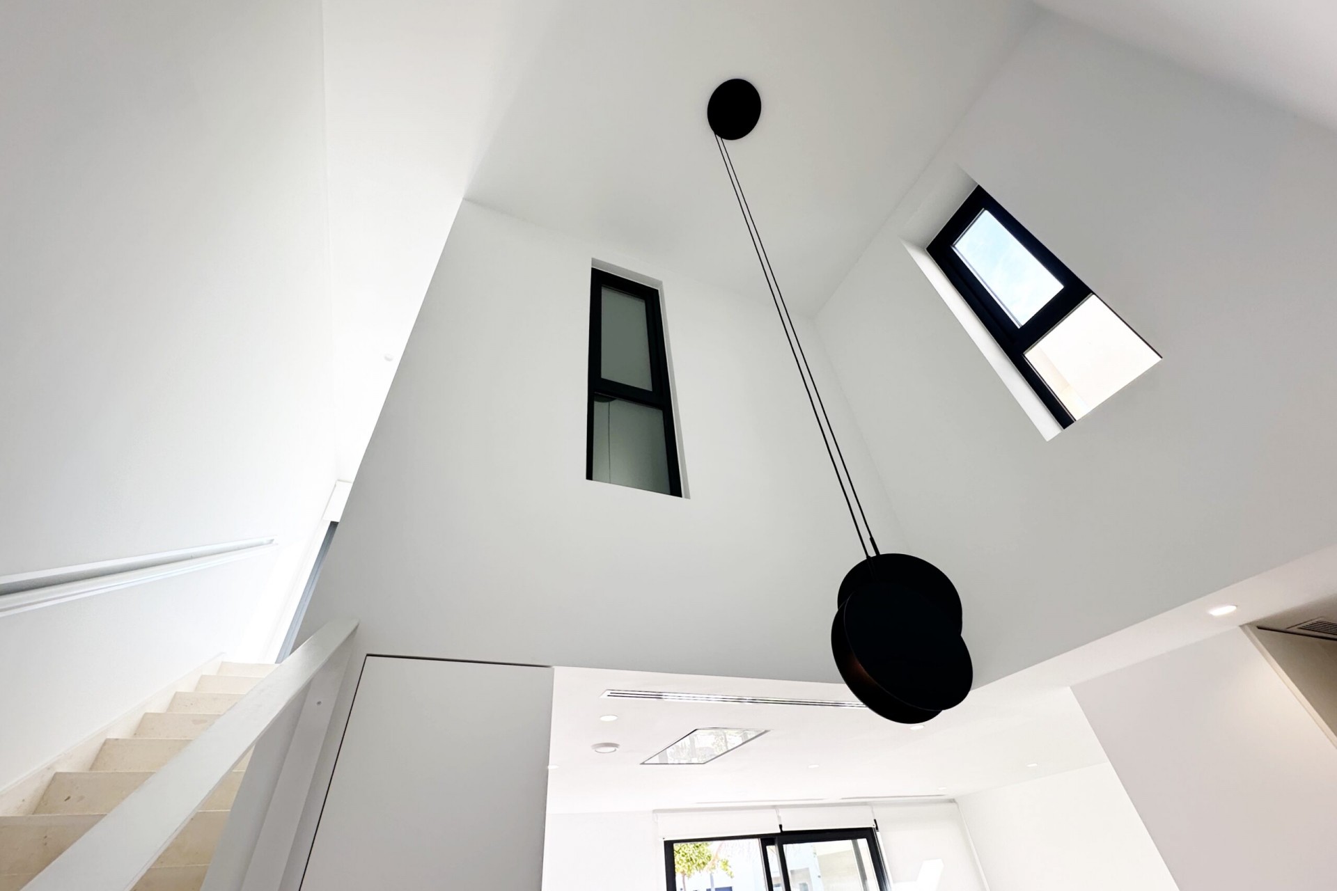 Upstairs, the master bedroom offers a walk-in wardrobe, an en-suite bathroom and its own private terrace. From this floor there is access to a spacious south-facing terrace, shared between the master suite and the hallway.